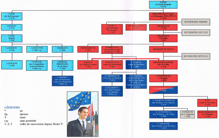(en bleu roi : les rois de France « de jure » ; en rouge : les rois d’Espagne)